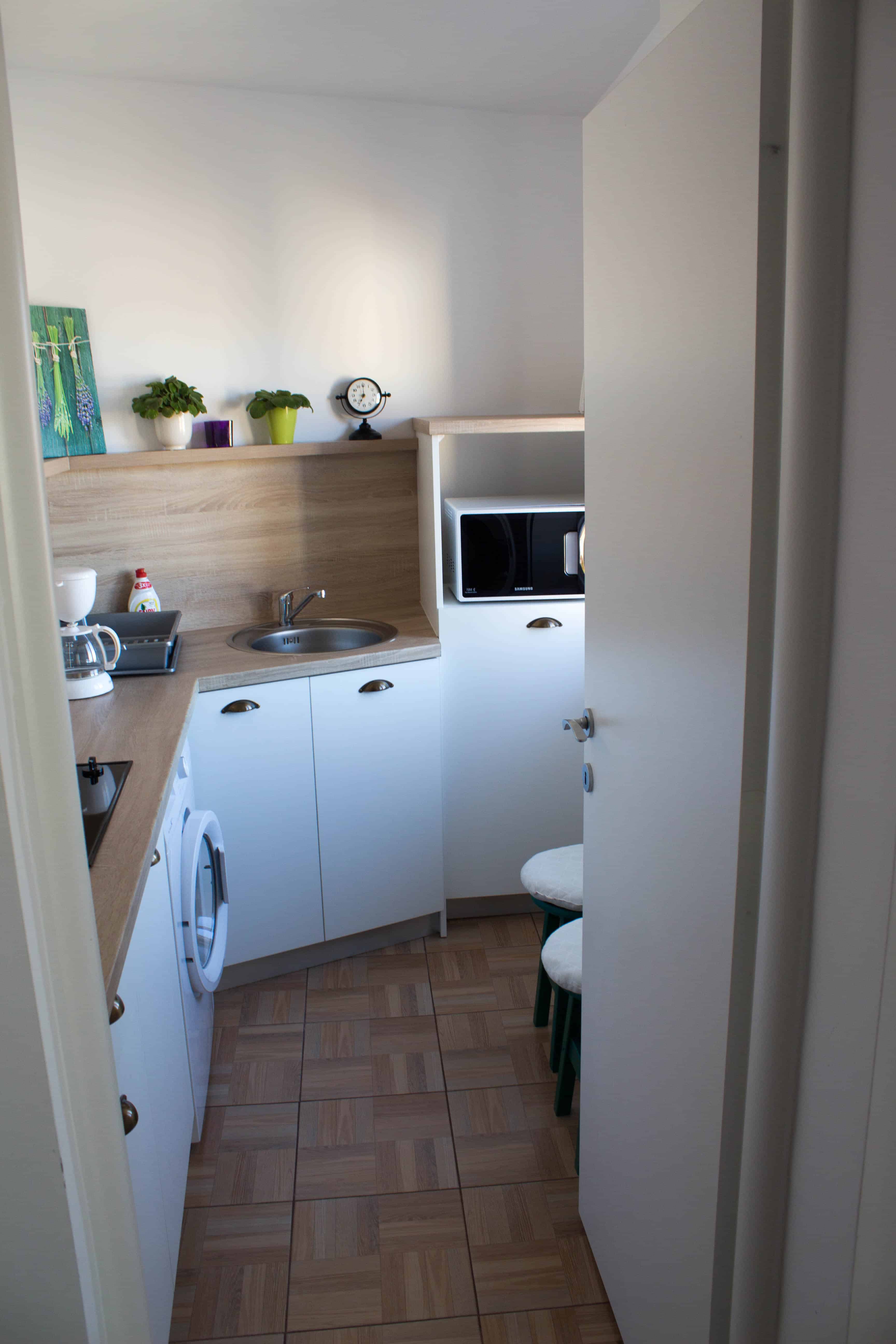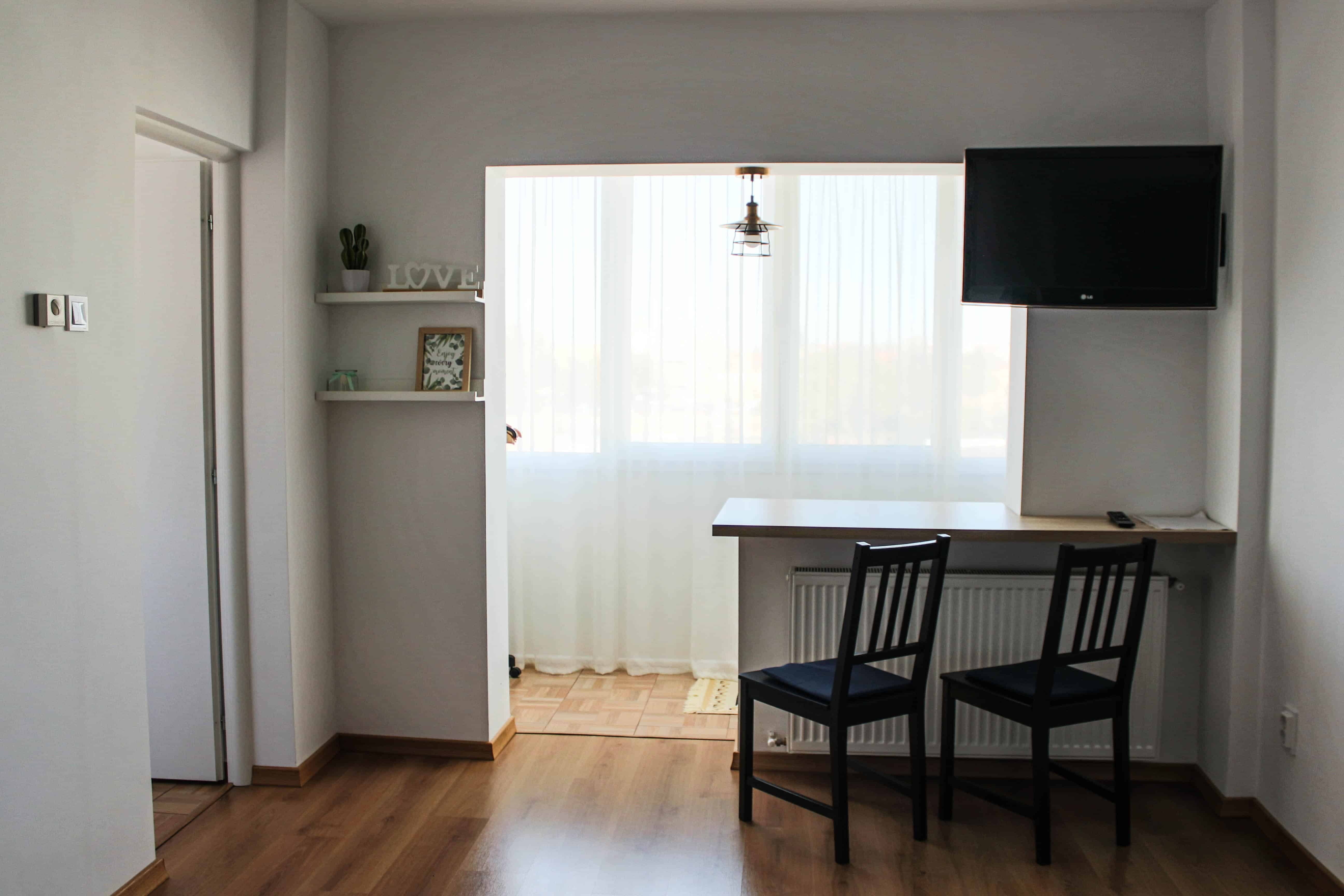 Garsoniera dispune de un pat matrimonial 160x200 cm, un pat pliabil 90x200 cm și televizor LCD cu diagonala de 81cm, bucătărie utilată cu aparatură electrocasnică modernă și baie.